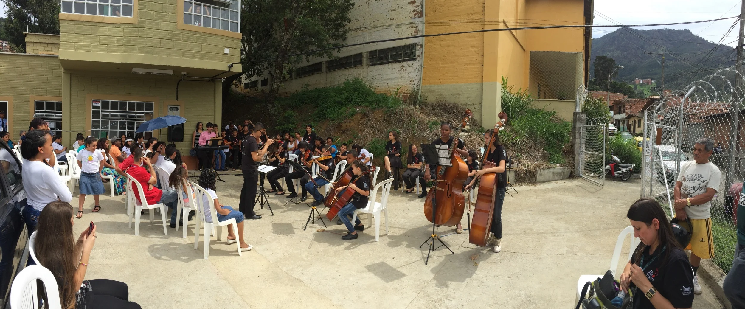 Parents and siblings beaming on folding chairs for an outdoor recital—the last before the school closed for winter holiday break—held in the driveway of a two-story house that serves as the network’s smallest school. The Escuela de Música de Villatina sits high on a hill in Comuna 8 in the eastern part of the city, reached via narrow streets lined with small houses and shops. Advanced students waited patiently as beginners took their turn. The director, Alvaro Acosta, gracefully made space for a longtime student, now in college, to conduct one piece. The stories I heard as I sat and listened are the ones my heart longs to hear: a boy who felt he could never fit in finding ways to connect and and form friendships through music and the community it created; a girl who sustained herself through her mother’s long illness and passing through music and the sense of extended family it enabled.
