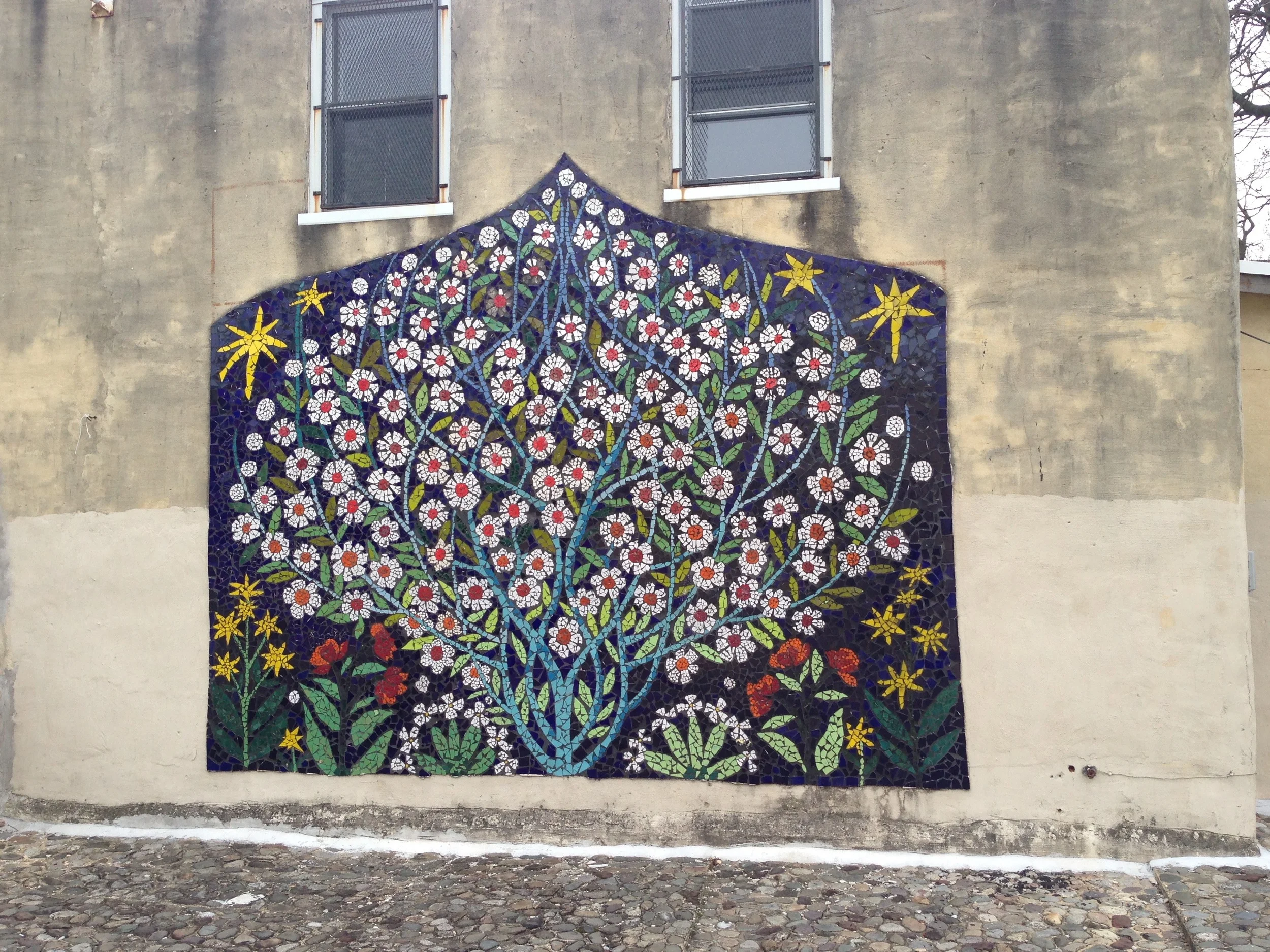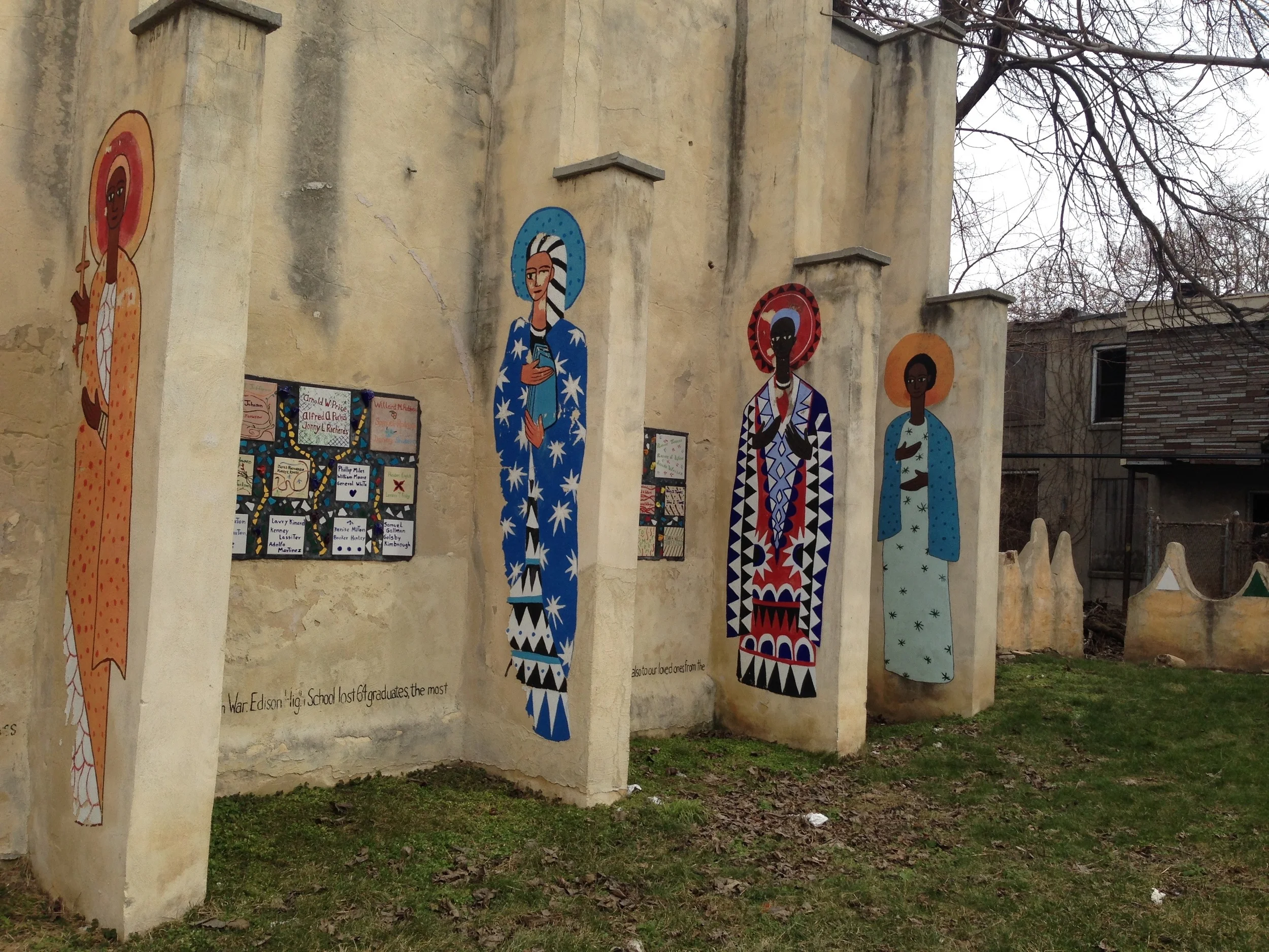 A day after meeting with Lily, I took the bus to the Village in North Philadelphia. The bus is crowded: an old man drops a bag of medication; a young woman amputee sits in a wheelchair. Every seat is taken on this somber gray day. Outside, many houses are shuttered, abandoned, or in a state of disrepair. Then the heart of the Village comes into view: vibrant mosaic benches, mysterious statues, a giant mural, and a cultural center.